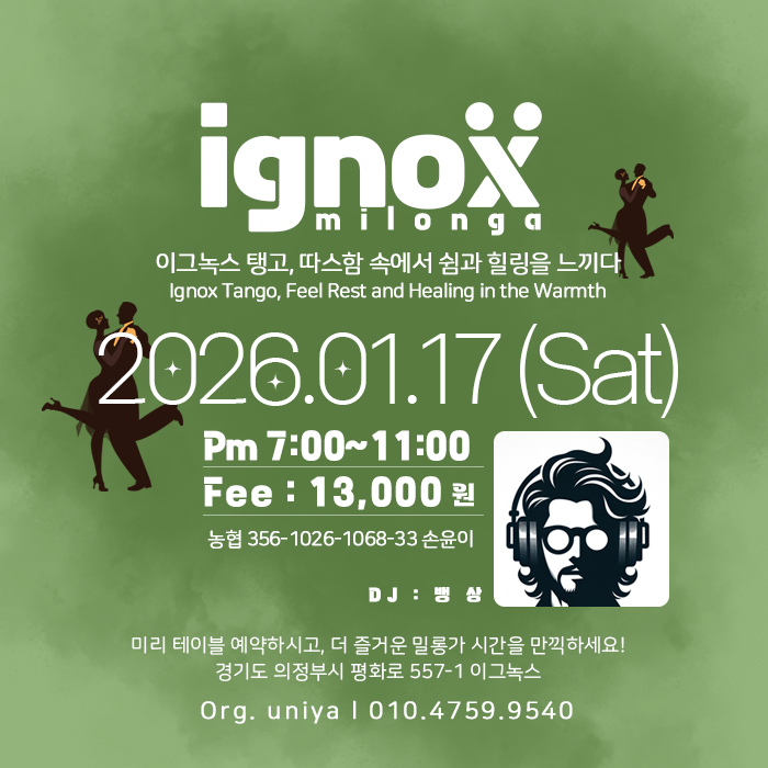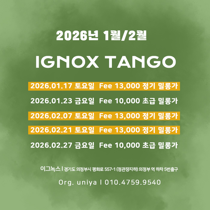 2026년의 첫 번째 밀롱가, 이그녹스에서 당신과 함께 첫 발걸음을 떼고 싶습니다. 이곳에서 나누는 따뜻한 눈빛과 위로가 올 한 해 여러분의 삶에 작은 등불이 되기를 진심으로 바랍니다.